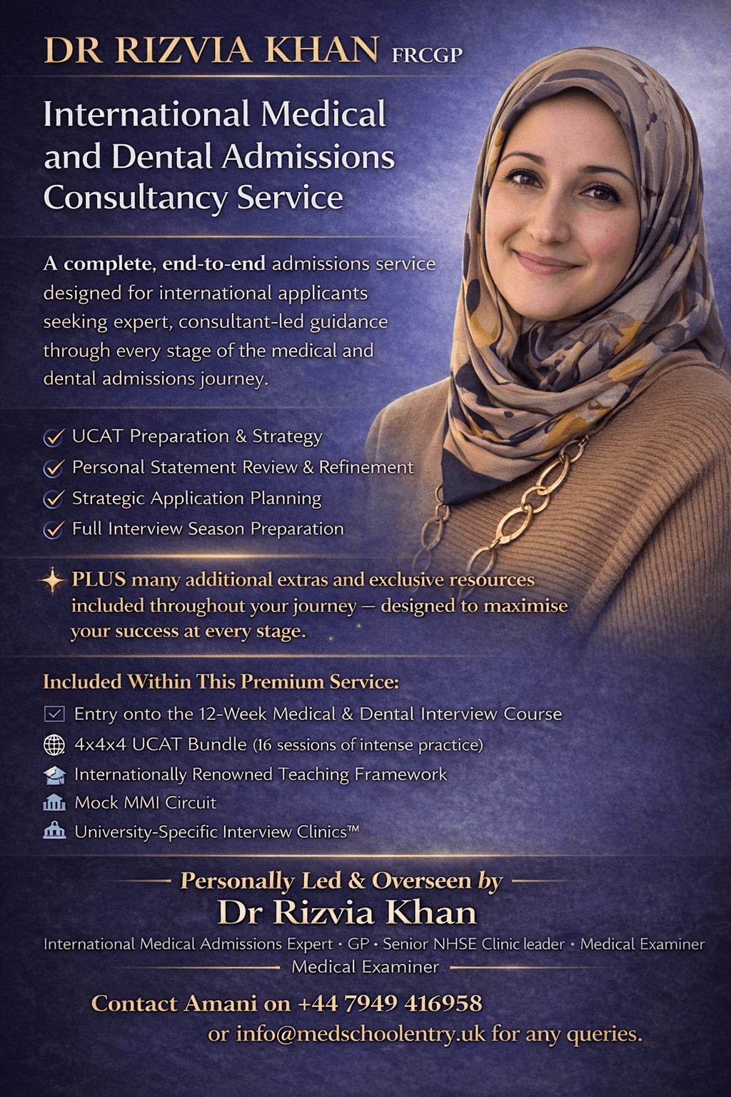 Drawing on over a decade of admissions expertise, Dr Rizvia Khan delivers a fully bespoke, premium service tailored to your academic background, goals, and circumstances.